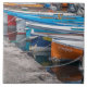 Ett vackert foto av färgade fiskebåtar i en rad tryckt på en keramisk bricka.