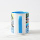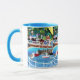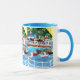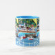 En vit mugg av bra med pulverblå fälg och handtag och en handmålad papper kollageutformning av en liten hamn med fiskebåtar och fiskmås. Se även matchande hälsningskort, presenter och kläder.