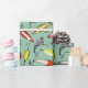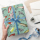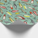 Det här presentfiguret har illustrationer av fisketur som inspirerats av vintagens fiskelagar i röda nyanser och gult på blekens bakgrund.