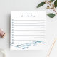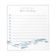 Anpassa det här anteckningsblocket med kustnära chic som är infogat för att göra-lista med två linjer anpassningsbar text i klassiskt blått skript och serif-bokstäver. Utformningen har en skola med blå vattenfärgsfisk som simmar längs grund. Visar "från [Namn] skrivbord" och infogade kryssrutor till behållan för alla dina viktigaste uppgifter.