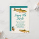 Inbjudningskort för fiskarens födelsedagsfest för vuxna män. Fläckig öring och flugfiske jig design på ecru papper med mörkblågrön text. Personalisera enkelt med hans namn, i fet stil, högst upp. All festinformation läggs till i styckeform. Välj utskrifts- och/eller nedladdningsalternativ.