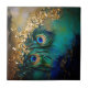 Två vackra 5D-tittar rosetter för pålfåglar sätts mot en vattenfärgad mörk blått, grönt och beige bakgrund som har abstrakt guldskalor på den. Denna bild inspireras av rörelsen art nouveau och är INTE ett sömlöst mönster. Det är idealiskt för hotell, semesterorter, byar, lägenheter och lägenheter som vill lägga till en accentdetalj i sina väggar. Lämplig för ryggsplash, badrum eller som köksdräkt.