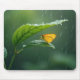 En känslig fjäril för orange vilar på en grönt löv mitt i fallande regnfall, som skapar en sund och livfull naturscen