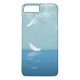 Två vita fjädrar som flyter över havet med solstrålar i molnet.