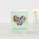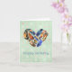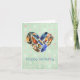 En födelsedagskort med en akvarelldesign med fjädrar i hjärtform. Färgerna inkluderar gul, orange, blå, grön och brun. Vissa har ränder, prickar, stam-mönster och andra unika kreativa dekorativa arrangemang. Placerad på en mintgrön vintagebakgrund med bleka rosa och vita prickar. Födelsedagsmeddelandet inuti kan anpassas eller personifieras för att passa din stil.