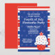 Denna röda, vita och blå fjärde juli-fest inbjudan har stjärnor och ränder och en rolig cupcake. Det är det perfekta sättet att inbjuda familj och vänner till din nästa 4:e juli-fyrverkerifest. Vissa delar av detta kort © Goodness and Fun