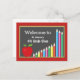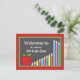 Denna välkommna back to schoolvykort presenterar ett svart tavlatema som betonas med färgpennor och ett rött äpple. Denna design är perfekt för någon elementär klass. Personifiera med ett beställnings- meddelande på baken.