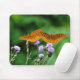 Två ljusa orange fjärilar vilar på purpurfärgade vildblommar.