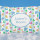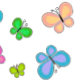 Roliga flerfärgade folksagostil-fjärilar fladdrar över denna söta blå och vit randiga bakgrund. Anpassa namn eller meddelande!