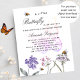 En vit bakgrund. Dekorerad med en stor fjäril, bin och målade vildblommor i violett och rosa. Personifiera och lägg till ett namn och festdetaljer.