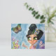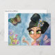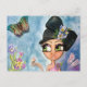 Bedårande vykort med en tropisk skönhet med stora ögon som älskar fjärilar och blommor.