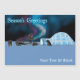 En digital målning med en igloo på polarnas isförpackning, sled hundar och en man i en parka. Den norra ljus-glöden. Texten "Säsongens hälsningar" visas i blått och vitt. Lägg till ytterligare text.