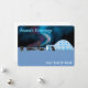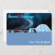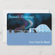 En digital målning med en igloo på polarnas isförpackning, sled hundar och en man i en parka. Den norra ljus-glöden. Texten "Säsongens hälsningar" visas i blått och vitt. Lägg till ytterligare text.