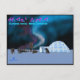 En digital målning med en igloo på polarnas isförpackning, sled hundar och en man i en parka. Den norra ljus-glöden. Kuvianak Inovia är God jul på Inuktitut (Eskimo). Ovanför den engelska texten visas Kuvianak Inovia i Inuktitut alfabet.