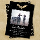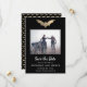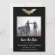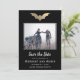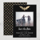 Med en fantastisk folie fladdermus kan du välja Spara datumkortet. Bakgrunden är svart med matchande guld fladdermus mönster. Perfekt för en goth eller Halloween bröllop.