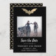 Med en fantastisk folie fladdermus kan du välja Spara datumkortet. Bakgrunden är svart med matchande guld fladdermus mönster. Perfekt för en goth eller Halloween bröllop.