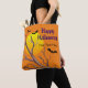 Den här Halloween-väskan har en skarp gult fullt måne i orange, med träd gren och tre fladdermus i förgrunden. Du kan anpassa texten "Happy halloween" och det finns ett område där du kan lägga till ytterligare text.