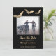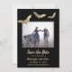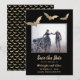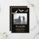 Den vackra folie fladdermus gör att det här Spara datumkortet utseendet. Bakgrunden är svart med matchande guld fladdermus mönster. Perfekt för en goth eller Halloween bröllop. Se samordna saker i vår butik, Enchanted Finch.