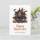 Halloween-kort med hemsökt hus, pumpor, fladdermus och ett skelettspöke med jack o'lantern. Anpassa enkelt det här vattenfärgen Halloween-kortet med din familj namn och text.