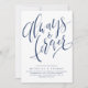 Modern, enkel bröllopsinbjudan, handskript med texten "alltid och för alltid" i marinblått och vitt, anpassa den med dina uppgifter om bröllop, elegant och snyggt. Se alla matchande delara i samlingen.