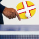 Ping Pong Paddle med utformning med en flagga av det historiska grevskapet Dorset i England, Underbara Storbritannien; gult flagga med vit kor med röd gräns