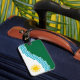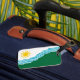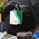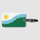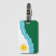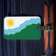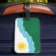 Bagagetag med en design med flagga Spokane, Washington. En vit och grönt flagga med blå linjer som symboliserar Spokanefloden och Spokanefalls och en gult sol