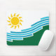 Mousepad med en design med flagga Spokane, Washington. En vit och grönt flagga med blå linjer som symboliserar Spokanefloden och Spokanefalls och en gult sol