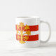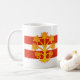 Mugg med design med en flagga av det historiska länet av Westmorland, i England, Storbritannien; vit och röd randig flagga med det guld- heraldiska äppleträd i centrera