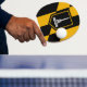 Ping Pong Paddle med flagga i staden Baltimore, Maryland; Black and gult flagga med en illustration av Battle Monument