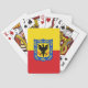 Poker spelar kort med design med flagga Bogota, huvudstaden Colombia, röd och gult flagga med jackande av arm med örn i mitten