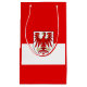 Papper väska med Brandenburgs flagga, utformad med två röda och vita band med statens jacka av arm med en illustration av en rödörn i mitten