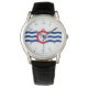 Se upp med flagga Cincinnati, Ohio, vit flagga med tre blå vinkarare med rött "C" i mitten