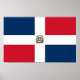 Dominikanska republikens flagga, som beskrivs i artikel 96 i Dominikanska konstitutionen, har ett centrerat vitt kor som sträcker sig till kant och delar upp flagga i fyra rektanglar. De översta är blå (på den blåa sidan) och röd, och grund är röda (på den blåa sidan) och blå. En stor jackat av arm som har en sköld med flagga-utformning och som stöds av ett lager gren (lämnat) och en handflatan-frond (höger) är i mitten av kor. Ovanför skölden finns ett blått band som visningar det nationella mottot: Dios, Patria, Libertad (Gud, Fatherland, Liberty). Under skölden visas ord República Dominicana på ett rött band (detta röda band visas i nyare versioner som att dess spetsar pekar uppåt). I mitten av skölden, som är täckt av tre spjut (två av dem som håller Dominikanska banderoller) på vardera sidan, är en bibel med en liten kor ovanför den och som sägs vara öppen för Gospelet John, antingen för kapitel ett eller kapitel 8, punkt 32, som lyder Y la verdad nos hará libre (och sanningen ska göra dig fri). Den blå på flagga står för frihet, den vita för frälsning, den röda för hjältarnas blod. Den civila utformningen följer samma utformning, men utan laddningen i mitten.