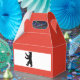 Box med flagga av Berlin, statlig flagga med vågrät rand av rött och vitt, med en illustration av en svart björn inuti en sköld