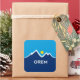 Ett märke med en utformning med flagga Orem, Utah. En blå, vit och gult flagga med bergstoppar och sol i mitten