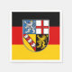 Papper napkin med flagga av Saarland; design med vågrät tricolor of black, red and gult (guldfärgad), med statens jacka av arm i mitten