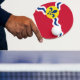 Pingpongpaddel med flagga av staden St. Louis; röd flagga med vit och blå vinkarare och blå loppur-de-lys i gulten cirkel
