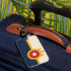 Luggage Tag med en utformning med flagga Tulsa, Oklahoma. En beige och marin blå flagga med en guld Osage-sköld som innehåller en röd cirkel och en beige sexuddig stjärna