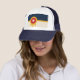 Truckerkeps med utformning med flagga Tulsa, Oklahoma. En beige och marin blå flagga med en guld Osage-sköld som innehåller en röd cirkel och en beige sexuddig stjärna