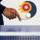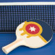 Ping Pong Paddle med en utformning med flagga Tulsa, Oklahoma. En beige och marin blå flagga med en guld Osage-sköld som innehåller en röd cirkel och en beige sexuddig stjärna