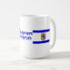 Denna härliga mugg visar flaggor av Staten Israel och huvudstaden av Jerusalem. I centrera bleknas ord "Shalom" och "fred" men det stilla sken igenom som det passionerade hoppet och bönen för världsfred.