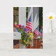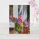 Söt pansies och den amerikanska flagga framför The Commercial Hotel of Ironton, som högtidlighåller minnesdagen. På Main Street i Ironton, Missouri