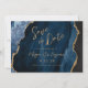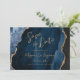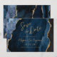 Med det här elegant bröllop sparar du datumkortet en bakgrundsbild av marinblått vattenfärgsagat som trimmas med faux guld glitter. Anpassadet kombinerar modern handskrift, tryckplåt och kursivt typsnitt med guld-färgad. Den omvända sidan har en samordnande marinblå och guld-agatdesign.