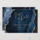 Med det här elegant bröllop sparar du datumkortet en bakgrundsbild av marinblått vattenfärgsagat som trimmas med faux guld glitter. Anpassadet kombinerar modern handskrift, tryckplåt och kursivt typsnitt med guld-färgad. Den omvända sidan har en samordnande marinblå och guld-agatdesign.