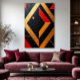 Energetisk geometrisk abstraktion! Diamanter och trianglar i svart, guld och intensivt rött, där struktur ökar djupet. En bildexplosion som blandar matematisk stringens och kromatisk passion - perfekt för modern konst älskare som söker modiga konster.