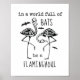 Illustration av 2 flamingo skelett omgivet av fladdermöss med "I en värld av fladdermöss är fullt ett flaminghoul"