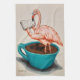 A flamingo stands in a cup of coffee (or tea) to read a book. Original art handmade by Sue Clancy using ink and gouache.