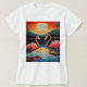 A.I. assisterad utskrift av två Flamingos som lockats till varandra står på ett snyggt sätt i ett levande landskap, med ett stort sol bakom blå berg och ovanligt surrealistiskt träd eftersom vatten återspeglar deras elegant och det levande färgen i himmel.