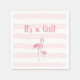Mor och baby rosa flamingos på ett trendig rosa och vit vattenfärgsstrimlad napkin med texten "det är en flicka!". Toppen söt.