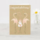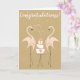En rolig, stilren bröllopsdesign med en retro touch för. Ett par rosa flamingos står på varsin sida om en bröllopstårta med rosa hjärtan, konfetti, guldringar och kurvor mot en neutral brun färgskiftande bakgrund. En anpassningsbar design för dig att anpassa med din egen text, bilder och idéer. En originell digital konstbild.